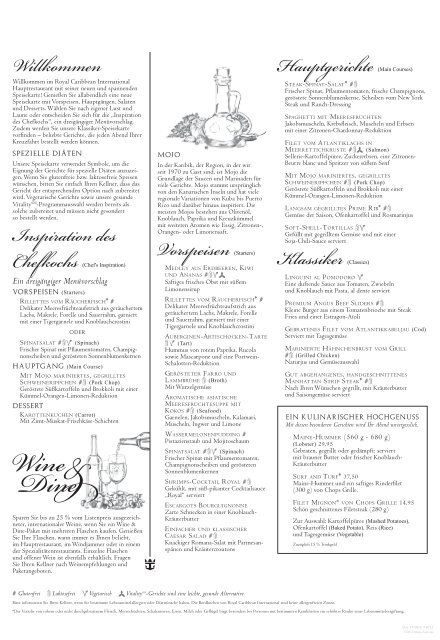 Speisekarte Royal Caribbean International from img.yumpu.com Liebe gäste, wir haben von montag bis sonntag von 11.00 bis 20.00 uhr durchgehend warme küche. Ny strip am knochen gereift. Inspiriert von zutaten aus aller welt werden alle gerichte stets frisch zubereitet. Lassen sie sich verwöhnen und genießen sie unsere köstlichkeiten. Alles ist frisch und aus natürlichem anbau. Blättern sie online durch unsere speisekarte und holen sie sich appetit für einen abend voll kulinarischer köstlichkeiten. Hochzeitssaal, restaurant, bar und tanzlokal am friedberger. Sortiert nach vorspeisen, suppen, hauptgänge, dessert, nachmittagskarte, uvm.